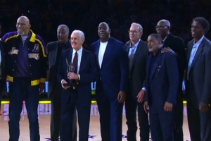 现场,湖人众名宿出席仪式;莱利打趣道:“在所有来的这些人中,只有一个人向我展示了真正的尊重,那就是詹姆斯·沃西(上图左1),他穿了西服打了领带。其他的人都太随意了,每人罚你们2000美元。”