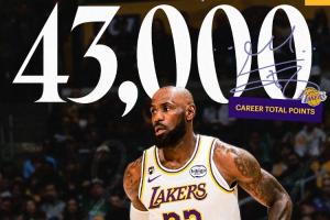 本场比赛,詹姆斯得到20分4篮板5助攻2抢断1盖帽,NBA生涯常规赛总得分突破43000(43008分)大关,成为史上首位43000分先生。