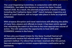 当地时间3月16日,当地组织委员会与欧足联和南美足联协商后,决定取消2026年卡塔尔足球节。因此,原定在卡塔尔举行的一系列活动,包括在卢塞尔体育场进行的阿根廷对阵西班牙的2026年卡塔尔欧美杯比赛,将不再按原计划在多哈举行。