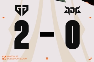 后期Junjia皇子追击Canyon蔚反被击杀,GEN轻松吃掉大龙,JDG四人接团再送中上二人,GEN经济优势超过1w。最终GEN中路推进,JDG再次不堪一击,GEN打出1换4一波推平JDG基地拿到赛点。