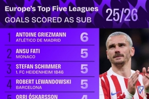 体育资讯3月20日讯 本赛季,马竞老将格列兹曼依然保持着良好的状态,尽管西蒙尼主要将他作为替补使用。本赛季迄今为止,格列兹曼在西甲中替补登场已打进6球,位居五大联赛所有球员之首。