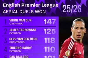 体育资讯3月24日讯 Squawka统计了本赛季球员在英超的争顶成功次数,并列出榜单,范戴克147次居首,并且他的成功率为75.77%,争顶100+球员中最高。