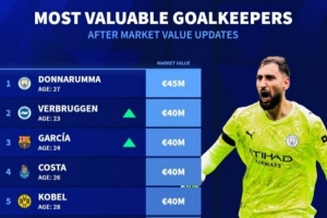 体育资讯4月5日讯 转会市场网更新了门将身价排行榜,目前曼城门将多纳鲁马身价4500万欧元最高,在他身后是布莱顿门将维尔布鲁根,身价4000万欧元。