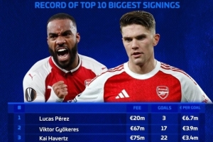 体育资讯4月7日讯 阿森纳将在本轮欧冠对阵葡体,约克雷斯面对旧主能否有所发挥值得期待。数据统计显示,考虑到转会费成本,他当前仍是阿森纳队史每进1球花费第二高的前锋。